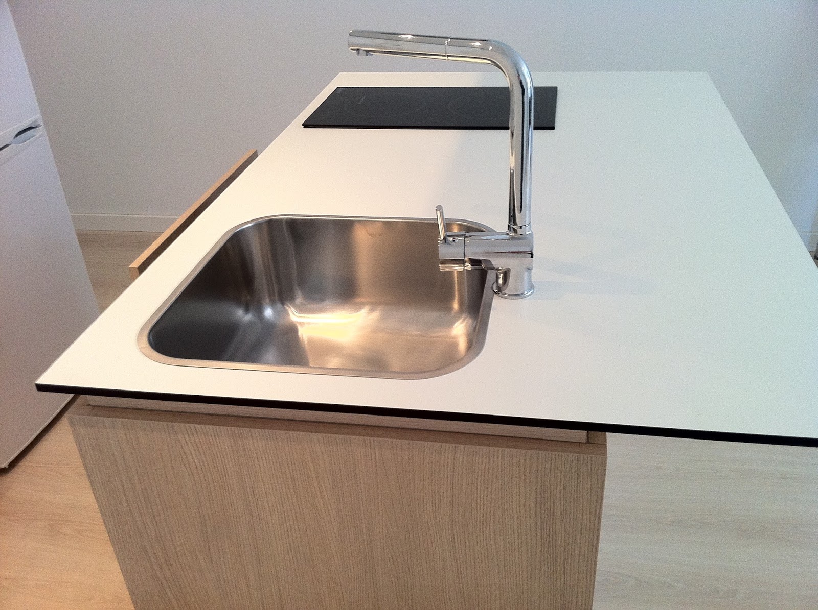 La encimera de esta isla está hecha de Panel Fenólico, que es un material extremadamente duro, con altísima resistencia al rayado, impermeable que ni decolora ni se mancha.