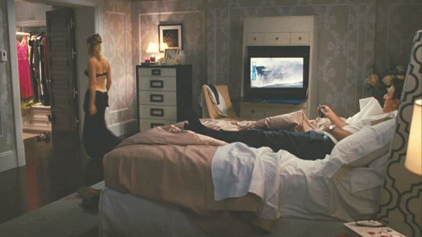 Y aquí, lo mejor de la película,¡la habitación de Erika! Se repite el mobiliario a medida, los tonos neutros combinados con tonos madera, las mesillas distintas, iluminación indirecta. ES IDEAL!