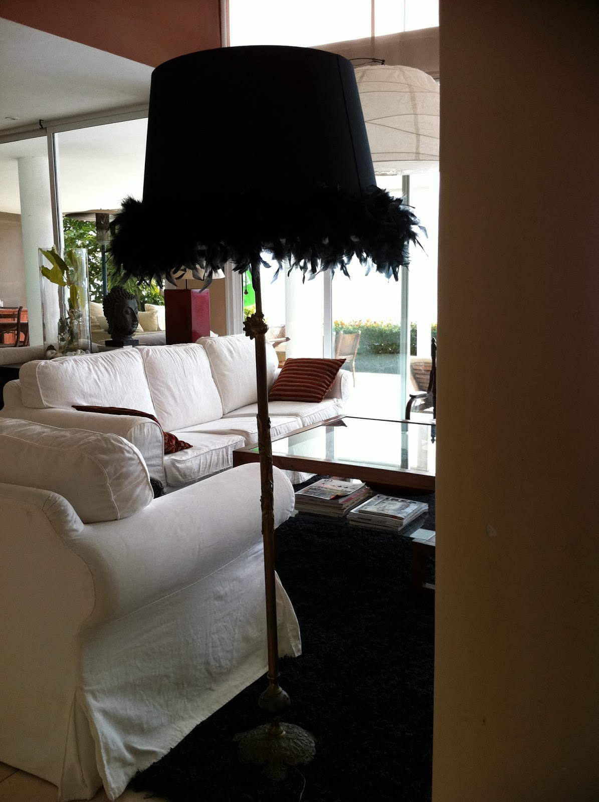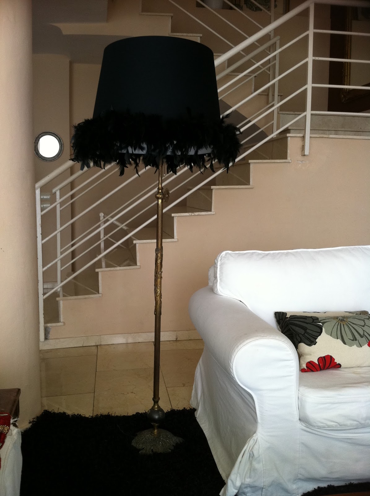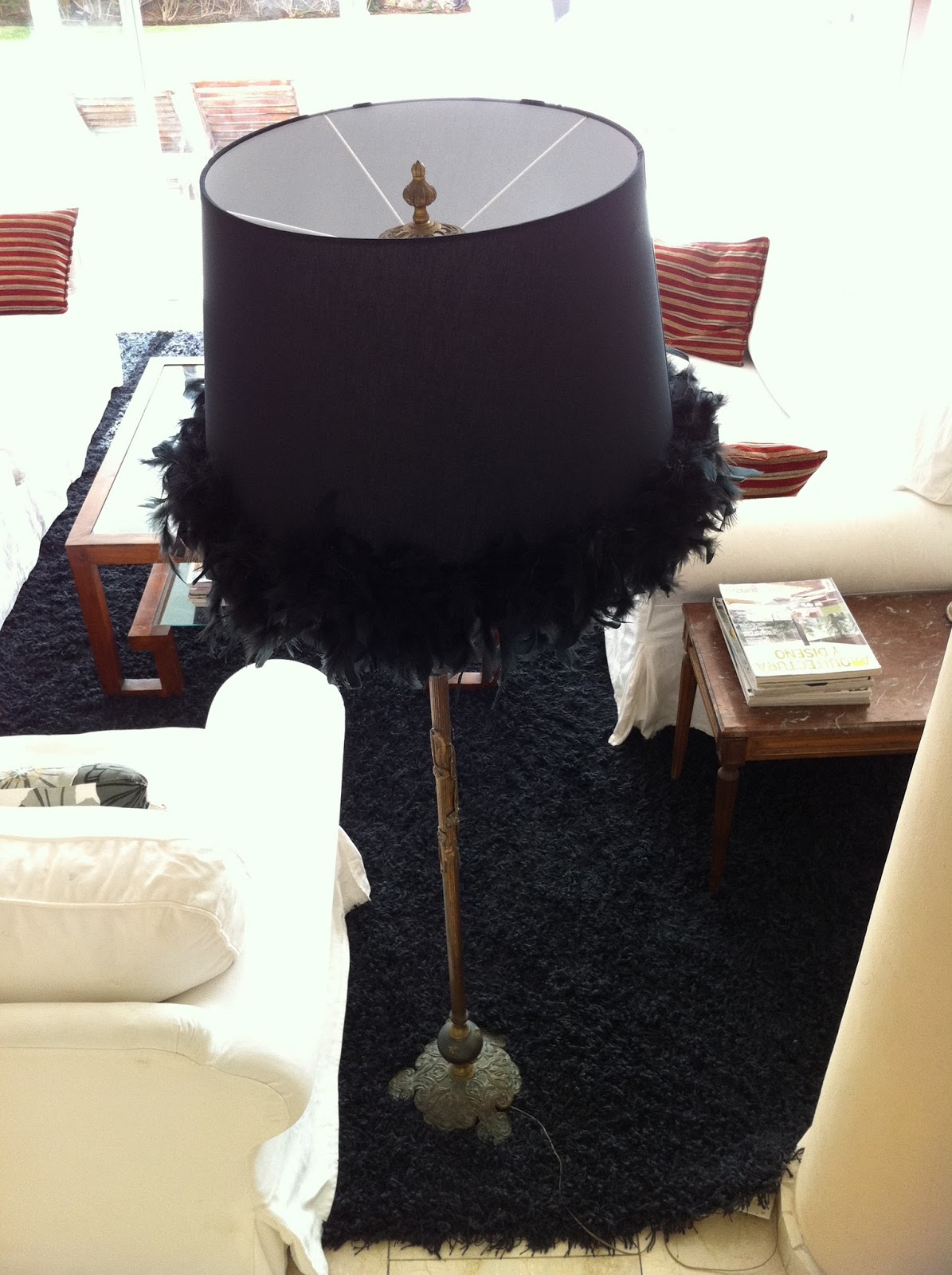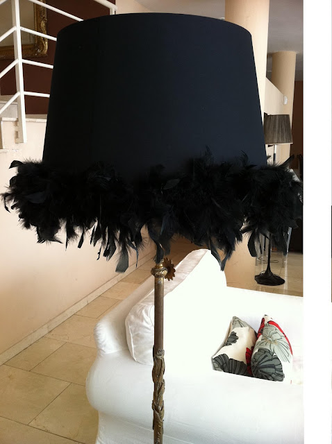 Ya os puedo mostrar el resultado de mi última visita al rastro (ver antes aquí). Para la lámpara simplemente he cogido una pantalla muy grande y le he puesto una tira de plumas alrededor. Me gusta el toque glamouroso de las plumas.